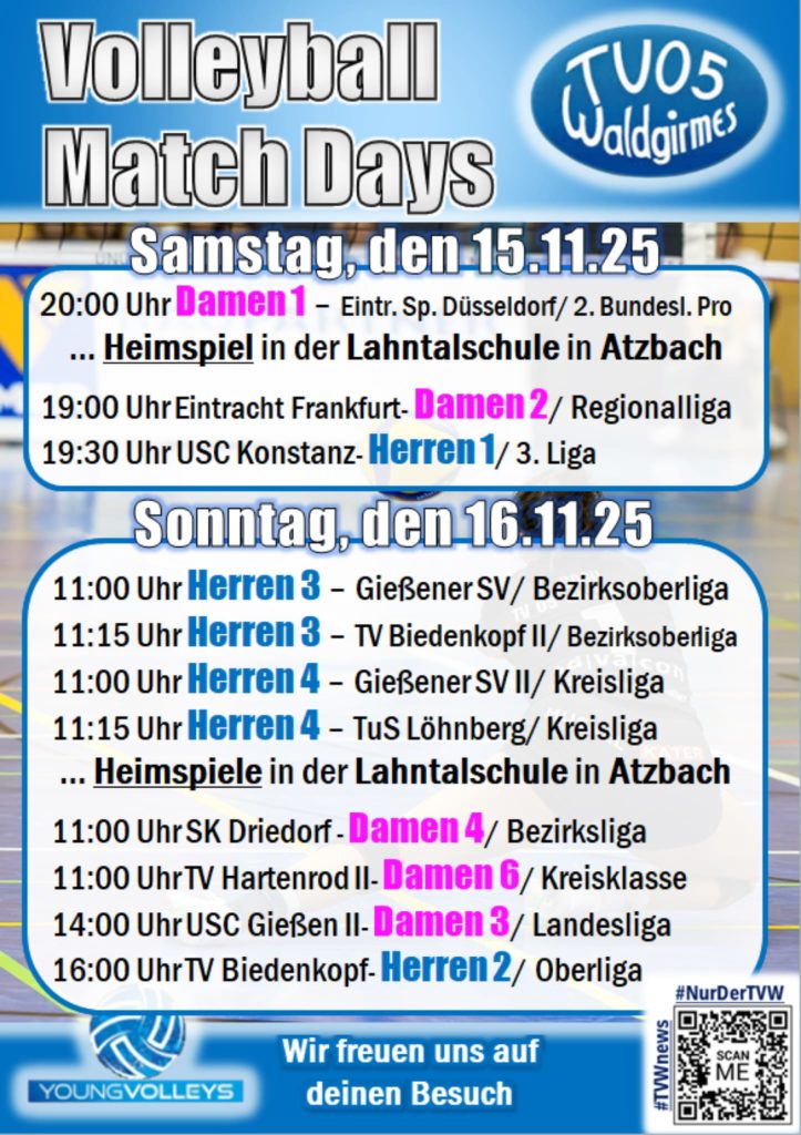 Oberliga Männer: TV Waldgirmes II vs. VC Ober-Roden – 3:2 (22:25, 25:20, 25:16, 20:25, 15:13). Die zweiten Herren des TV Waldgirmes haben am Samstag, dem 08.11.2025, in einem Fünfsatz Nervenkrimi gegen den VC Ober-Roden einen wichtigen und hart umkämpften 3:2-Heimsieg eingefahren. Mit diesem Erfolg festigen die Lahnauer ihren aktuell beeindruckenden 5. Tabellenplatz in der Oberliga und untermauern ihre Ambitionen oben mitzuspielen. Obwohl der Start Weiterlesen