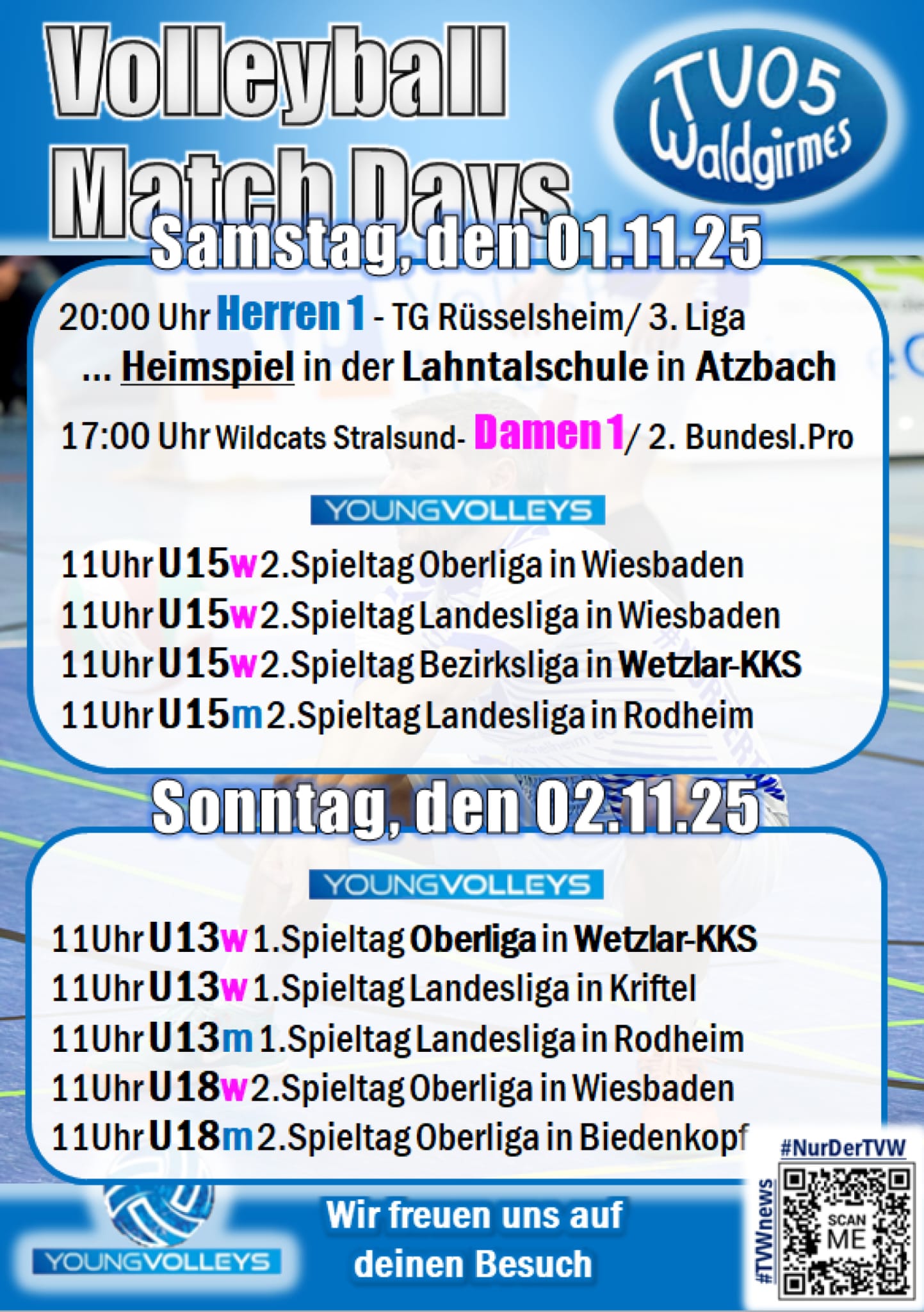 Dritte Liga Herren: TV Waldgirmes – TG Rüsselsheim, Samstag 01.11. um 20:00 Uhr in der Halle der Lahntalschule Atzbach. Bislang sind die Jungs von Trainer Lukas Zielinski sehr konstant. Zuhause hui und auswärts …Doch so ganz stimmt das nicht. Im letzten Auswärtsspiel ging es denkbar knapp her, Waldgirmes verlor unglücklich im Tiebreak und nahm immerhin einen Tabellenpunkt mit. Und wir alle hoffen nun auf einen weiteren Heimsieg. Der Tabellensechste aus Rüsselsheim liegt nur einen Punkt vor Waldgirmes hat sein letztes Spiel gegen die BEG glatt gewonnen. Daher wird es spannend, aber mit den Fans im Rücken und nach den bisher so eindrücklich gewonnen Heimspielen, dürften Punkte drin sein. #leidenschaftdieverbindet